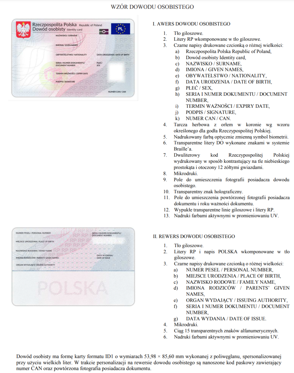 – dane dotyczące osoby oraz dane dotyczące dowodu osobistego wraz z danymi je uwierzytelniającymi: nazwisko, imię (imiona), nazwisko rodowe, imiona rodziców, datę i miejsce urodzenia, płeć, numer PESEL, obywatelstwo, dane biometryczne: wizerunek twarzy,  odciski palców,  serię i numer dowodu osobistego, datę wydania dowodu osobistego, datę ważności dowodu osobistego, oznaczenie organu wydającego dowód osobisty;